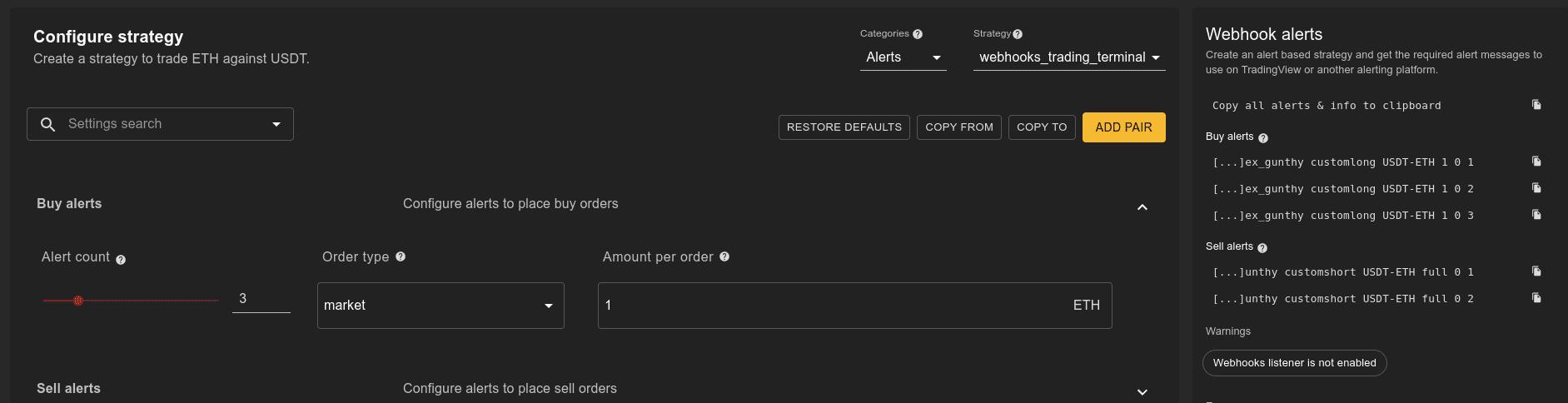 Next, head to Gunbot and add a pair with an alert strategy. Set the desired alert count and investment amount (see image below). Copy all the alerts which should look something like this: