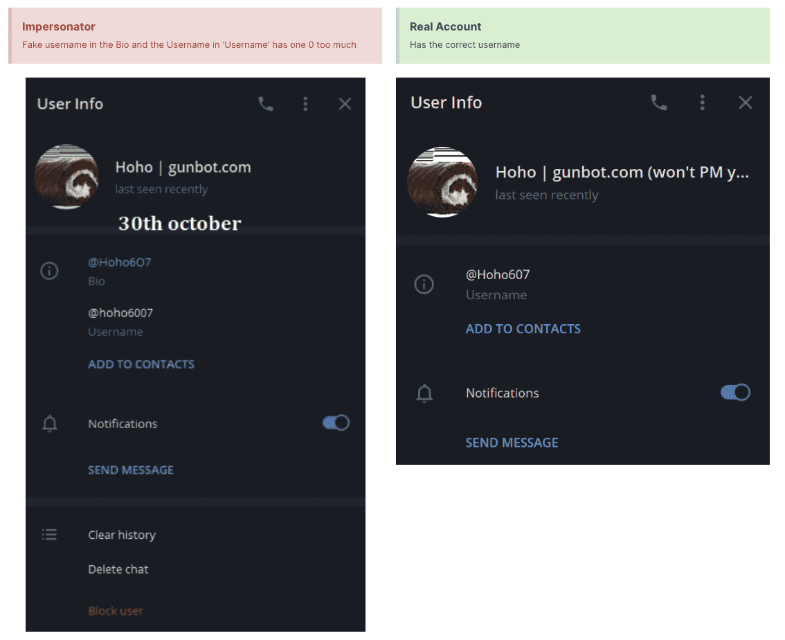 Example of a scam attempt in Telegram private message Scammer impersonating Gunbot support staff Warning signs of a potential Telegram scam Suspicious private message from unknown contact